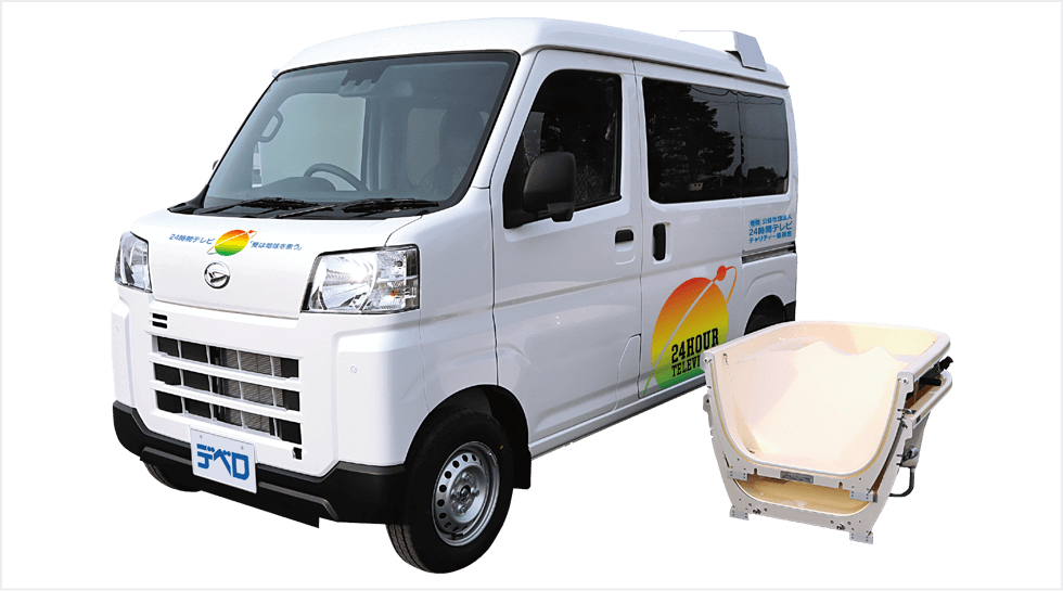 訪問入浴車訪問入浴に必要な浴槽やボイラー・ポンプ等の機材を装備。在宅で寝たきりの方のもとにお伺いし、お風呂の機会を提供しています。 -