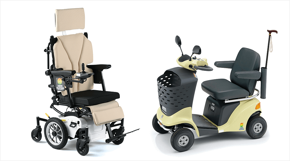 電動車いす障害のある方や高齢者の方の移動や外出をサポート。手が不自由な方でも手元レバーの操作によって電動で走行できます。 -