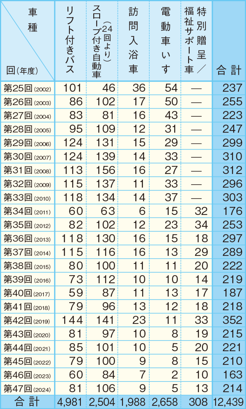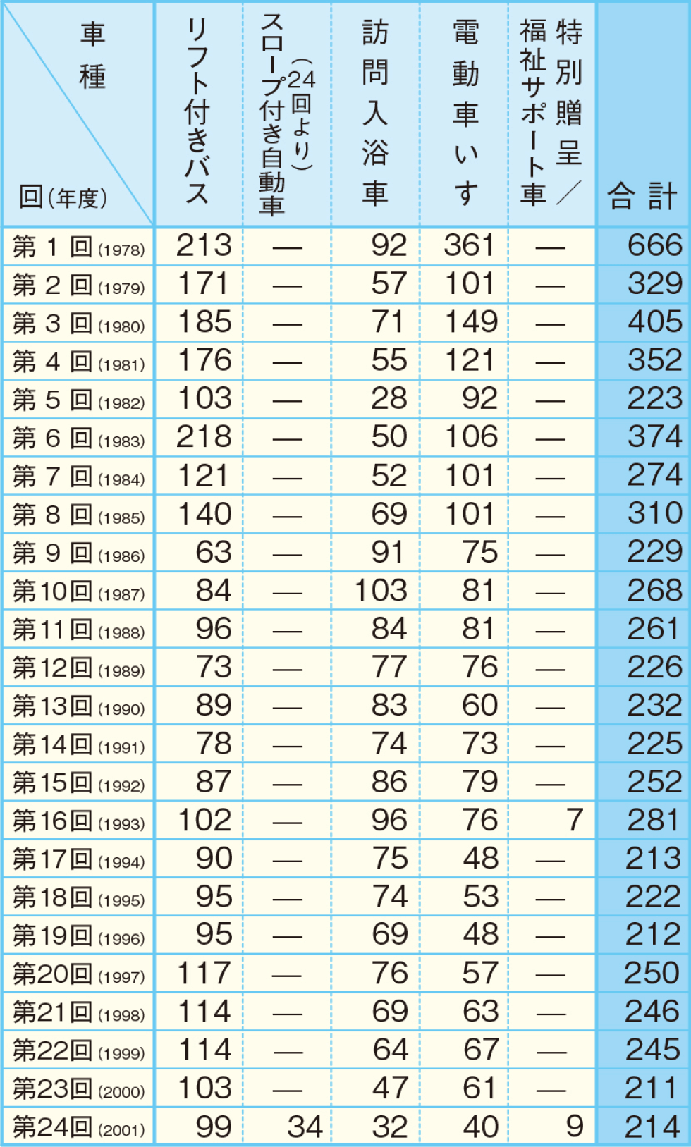 ●第36回より福祉サポート車を採用、災害復興支援で贈呈の車両はサポート車に含む。